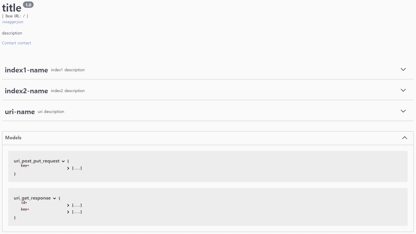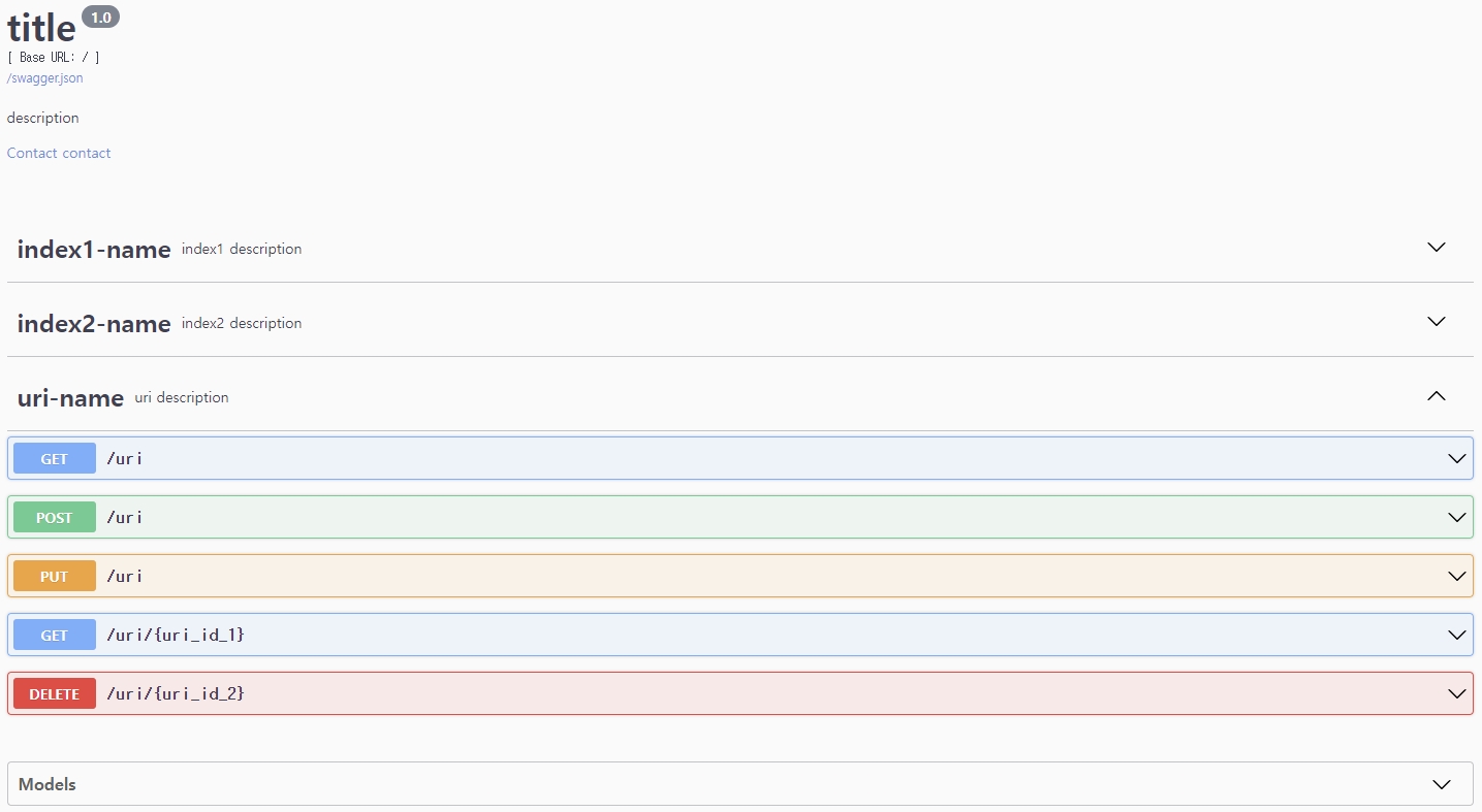 import logging from flask import Flask, request, jsonify, redirect, url_for, make_response from flask_restx import Resource, Namespace, Api, fields index1 = Namespace(name='index1-name', path='/index1', description='index1 description') @index1.route('', methods=['GET']) class Index1(Resource): def get(self): return redirect(url_for('index2-name_index2')) index2 = Namespace(name='index2-name', path='/index2', description='index2 description') @index2.route('', methods=['GET']) class Index2(Resource): def get(self): print("\n\n") print("request.method :", request.method) print("request.url :", request.url) print("request.url_root :", request.url_root) print("request.mimetype :", request.mimetype) print("request.headers :", request.headers) print("request.remote_addr :", request.remote_addr) if "key" in request.headers: print("request.headers[key] :", request.headers["key"]) return jsonify({"result": "index2 ok"}) uri = Namespace(name='uri-name', path='/uri', description='uri description') uri_post_put_request = uri.model(name='uri_post_put_request', model={ 'key': fields.String(description='description', required=True, example="value") }) uri_get_response = uri.model(name='uri_get_response', model={ 'id': fields.Integer(description='description', required=True, example=1), 'key': fields.String(description='description', required=True, example="value") }) @uri.route('', methods=['GET', 'POST', 'PUT']) @uri.route('/<uri_id_1>', methods=['GET']) @uri.route('/<int:uri_id_2>', methods=['DELETE']) class UriGet(Resource): @uri.response(200, 'OK', uri_get_response) @uri.response(500, 'Failed') def get(self, uri_id_1=None): print("\n\n") print("request.url :", request.url) print("uri_id_1 :", uri_id_1) print("request.query_string :", request.query_string) print("key :", request.args.get('key', '')) response = {"key": "value"} return jsonify(response) @uri.expect(uri_post_put_request) @uri.doc(responses={201: "Created"}) @uri.doc(responses={500: "Internal Server Error"}) def post(self): print("\n\n") print("request.method :", request.method) print("request.content_type :", request.content_type) print("request.content_length :", request.content_length) print("request.is_json :", request.is_json) if request.is_json: print("request.get_json() :", request.get_json()) else: print("request.form :", request.form) response = make_response('', 201 if request.method == 'POST' else 200) return response @uri.expect(uri_post_put_request) @uri.response(200, 'OK') def put(self): self.post() @uri.response(204, 'No Content') @uri.response(404, 'Not Found') def delete(self, uri_id_2): print("\n\n") print("uri_id_2 :", uri_id_2) print("request.remote_addr :", request.remote_addr) response = make_response('', 204) response.headers['X-TEST'] = 'value' return response if __name__ == "__main__": app = Flask(__name__) api = Api( app=app, version='1.0', title='title', description="description", contact='contact', contact_email='contact_email', ) api.add_namespace(index1) api.add_namespace(index2) api.add_namespace(uri) logging.basicConfig(level=logging.DEBUG) index2.logger.addHandler(logging.FileHandler("index2.log")) uri.logger.setLevel(logging.CRITICAL) print("\n") app.logger.debug('debug log') index1.logger.info('info log') index2.logger.warning('warning log') uri.logger.error('error log') uri.logger.critical('critical log') print("\n") app.run(debug=True, host='0.0.0.0', port=10000)