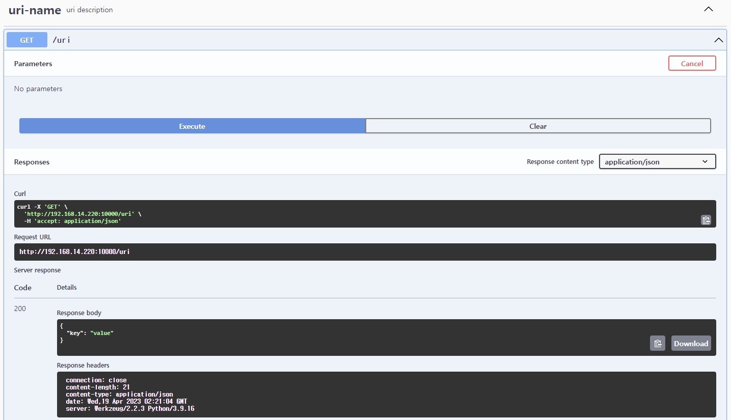 $ python server.py [2023-04-19 11:23:25,331] DEBUG in main: debug log DEBUG:main:debug log [2023-04-19 11:23:25,331] INFO in main: info log INFO:flask_restx.namespace.index1-name:info log [2023-04-19 11:23:25,331] WARNING in main: warning log WARNING:flask_restx.namespace.index2-name:warning log [2023-04-19 11:23:25,331] CRITICAL in main: critical log CRITICAL:flask_restx.namespace.uri-name:critical log * Serving Flask app 'main' * Debug mode: on INFO:werkzeug:WARNING: This is a development server. Do not use it in a production deployment. Use a production WSGI server instead. * Running on all addresses (0.0.0.0) * Running on http://127.0.0.1:10000 * Running on http://192.168.14.220:10000 INFO:werkzeug:Press CTRL+C to quit INFO:werkzeug: * Restarting with stat [2023-04-19 11:23:25,567] DEBUG in main: debug log DEBUG:main:debug log [2023-04-19 11:23:25,567] INFO in main: info log INFO:flask_restx.namespace.index1-name:info log [2023-04-19 11:23:25,567] WARNING in main: warning log WARNING:flask_restx.namespace.index2-name:warning log [2023-04-19 11:23:25,567] CRITICAL in main: critical log CRITICAL:flask_restx.namespace.uri-name:critical log WARNING:werkzeug: * Debugger is active! INFO:werkzeug: * Debugger PIN: 774-693-356 INFO:werkzeug:127.0.0.1 - - [19/Apr/2023 11:23:32] "OPTIONS /index1 HTTP/1.1" 200 - INFO:werkzeug:127.0.0.1 - - [19/Apr/2023 11:23:32] "OPTIONS /uri HTTP/1.1" 200 - INFO:werkzeug:127.0.0.1 - - [19/Apr/2023 11:23:32] "GET /index1 HTTP/1.1" 302 - request.method : GET request.url : http://127.0.0.1:10000/index2 request.url_root : http://127.0.0.1:10000/ request.mimetype : request.headers : Host: 127.0.0.1:10000 User-Agent: python-requests/2.25.1 Accept-Encoding: gzip, deflate Accept: */* Connection: keep-alive Key: value request.remote_addr : 127.0.0.1 request.headers[key] : value INFO:werkzeug:127.0.0.1 - - [19/Apr/2023 11:23:32] "GET /index2 HTTP/1.1" 200 - request.url : http://127.0.0.1:10000/uri uri_id_1 : None request.query_string : b'' key : INFO:werkzeug:127.0.0.1 - - [19/Apr/2023 11:23:32] "HEAD /uri HTTP/1.1" 200 - request.url : http://127.0.0.1:10000/uri uri_id_1 : None request.query_string : b'' key : INFO:werkzeug:127.0.0.1 - - [19/Apr/2023 11:23:32] "GET /uri HTTP/1.1" 200 - request.url : http://127.0.0.1:10000/uri/id uri_id_1 : id request.query_string : b'' key : INFO:werkzeug:127.0.0.1 - - [19/Apr/2023 11:23:32] "GET /uri/id HTTP/1.1" 200 - request.url : http://127.0.0.1:10000/uri?key=value uri_id_1 : None request.query_string : b'key=value' key : value INFO:werkzeug:127.0.0.1 - - [19/Apr/2023 11:23:32] "GET /uri?key=value HTTP/1.1" 200 - request.url : http://127.0.0.1:10000/uri?key1=value1&key2=value2-1&key2=value2-2 uri_id_1 : None request.query_string : b'key1=value1&key2=value2-1&key2=value2-2' key : INFO:werkzeug:127.0.0.1 - - [19/Apr/2023 11:23:32] "GET /uri?key1=value1&key2=value2-1&key2=value2-2 HTTP/1.1" 200 - request.method : POST request.content_type : application/x-www-form-urlencoded request.content_length : 9 request.is_json : False request.form : ImmutableMultiDict([('key', 'value')]) INFO:werkzeug:127.0.0.1 - - [19/Apr/2023 11:23:32] "POST /uri HTTP/1.1" 201 - request.method : POST request.content_type : application/json request.content_length : 16 request.is_json : True request.get_json() : {'key': 'value'} INFO:werkzeug:127.0.0.1 - - [19/Apr/2023 11:23:32] "POST /uri HTTP/1.1" 201 - request.method : PUT request.content_type : application/json request.content_length : 40 request.is_json : True request.get_json() : [['key1', 'value1'], ['key1', 'value2']] INFO:werkzeug:127.0.0.1 - - [19/Apr/2023 11:23:32] "PUT /uri HTTP/1.1" 200 - request.method : PUT request.content_type : application/json request.content_length : 30 request.is_json : True request.get_json() : {'key1': ['value1', 'value2']} INFO:werkzeug:127.0.0.1 - - [19/Apr/2023 11:23:32] "PUT /uri HTTP/1.1" 200 - INFO:werkzeug:127.0.0.1 - - [19/Apr/2023 11:23:32] "DELETE /uri/id HTTP/1.1" 405 - uri_id_2 : 123 request.remote_addr : 127.0.0.1 INFO:werkzeug:127.0.0.1 - - [19/Apr/2023 11:23:32] "DELETE /uri/123 HTTP/1.1" 204 -