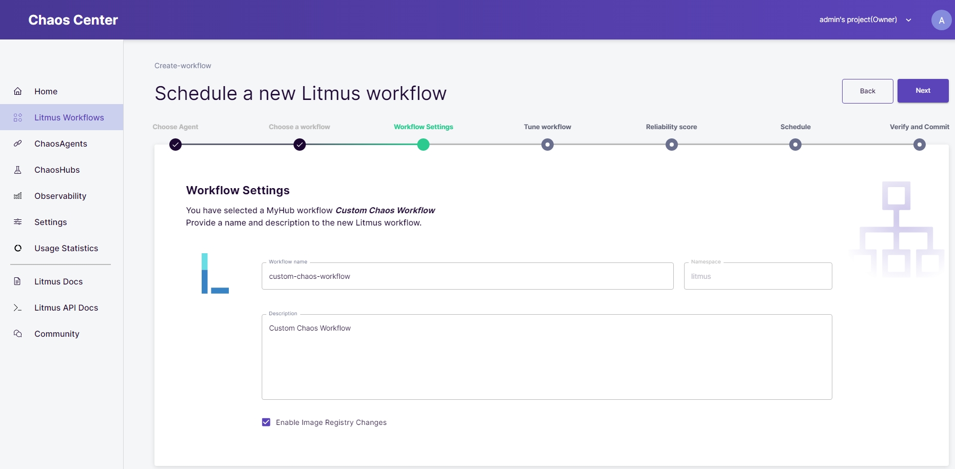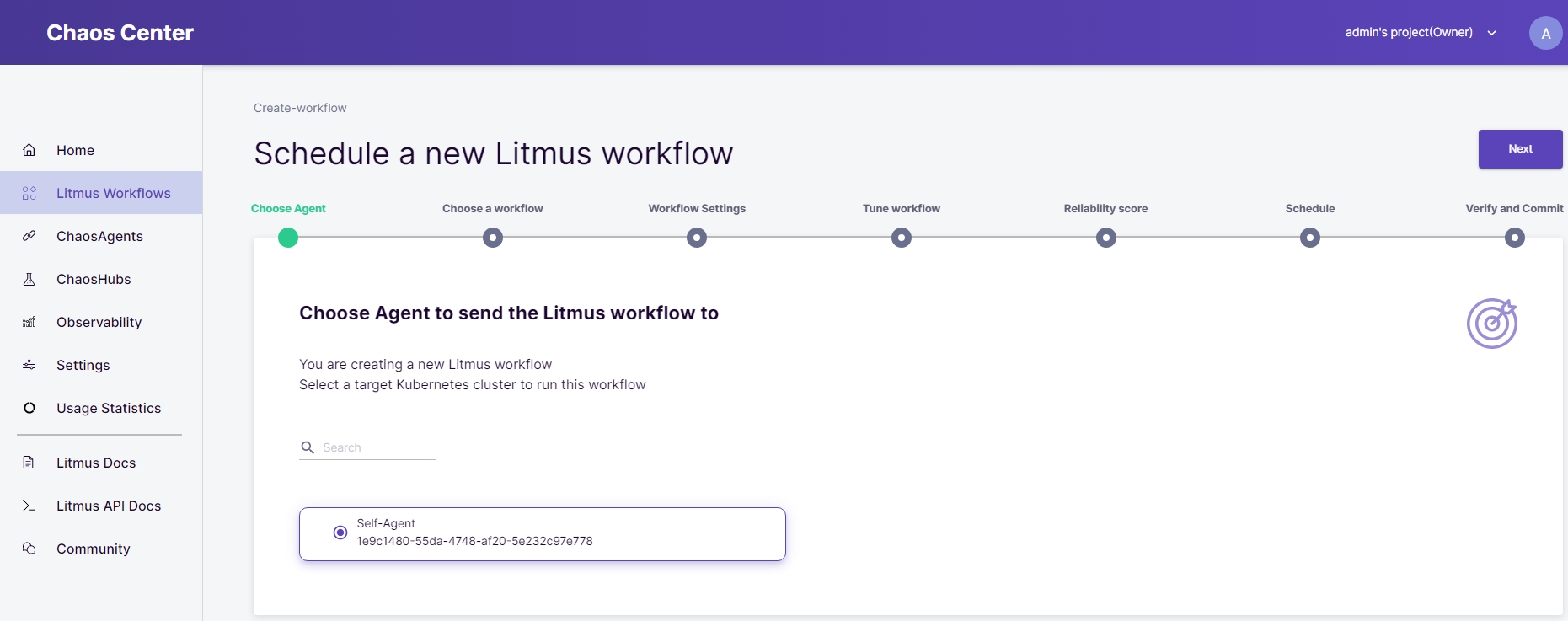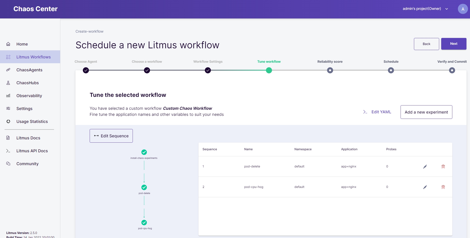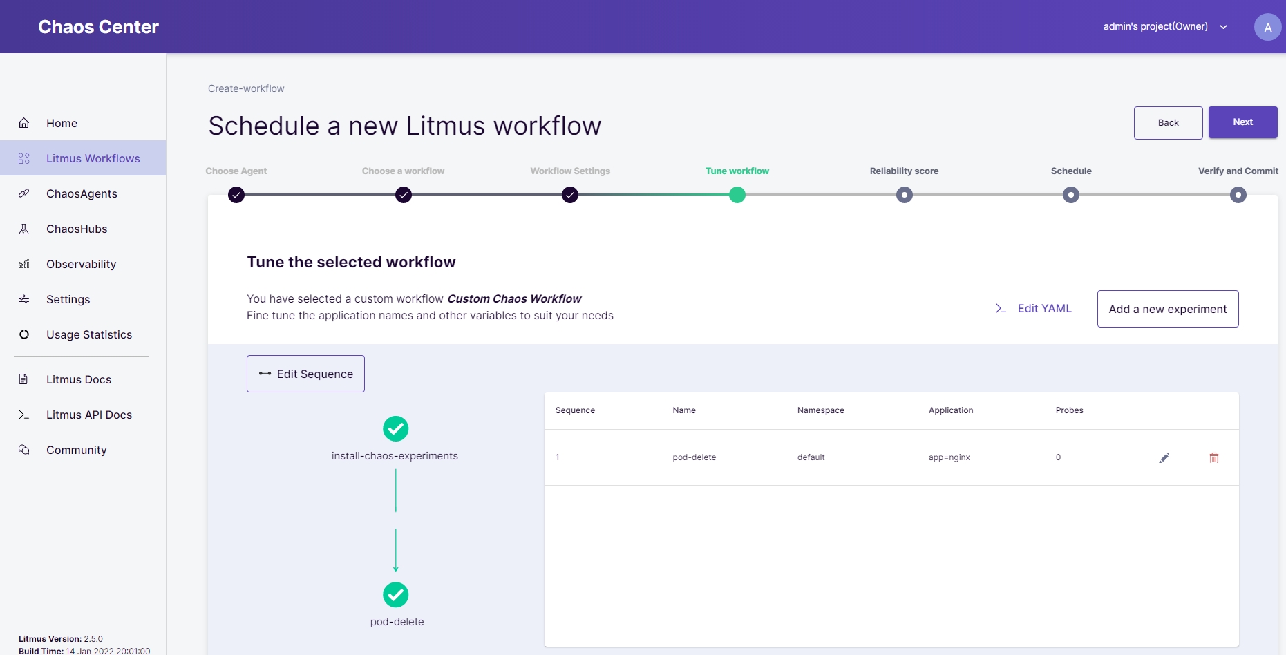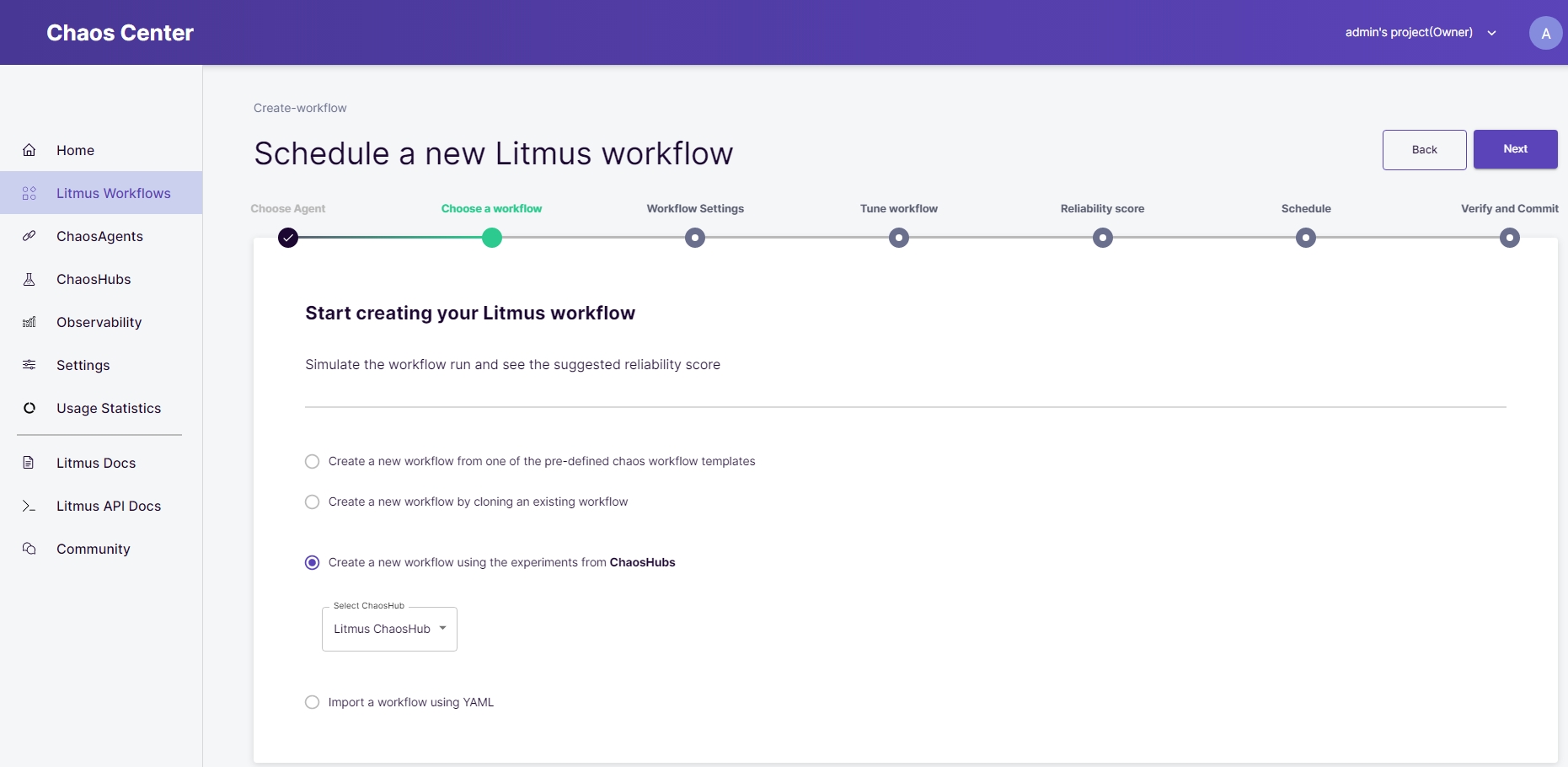 - Create a new workflow using the experiments from ChaosHubs 선택 후 Next 클릭