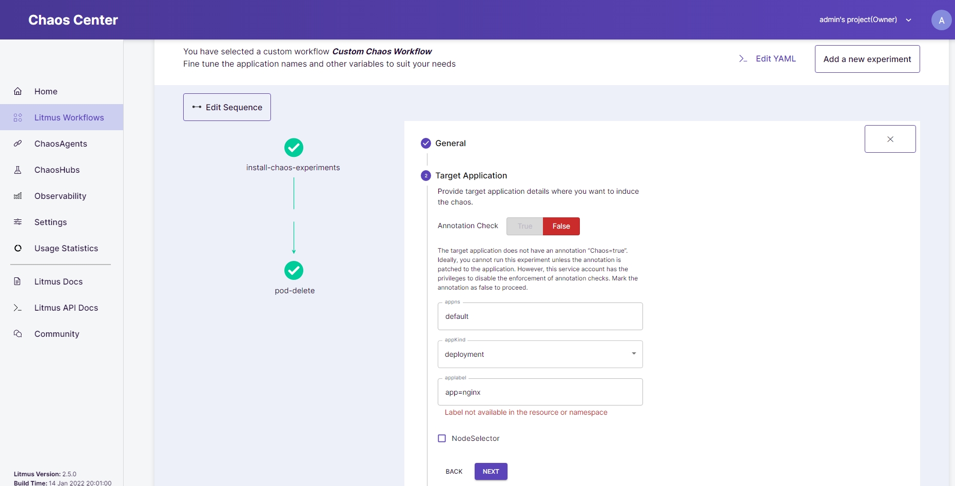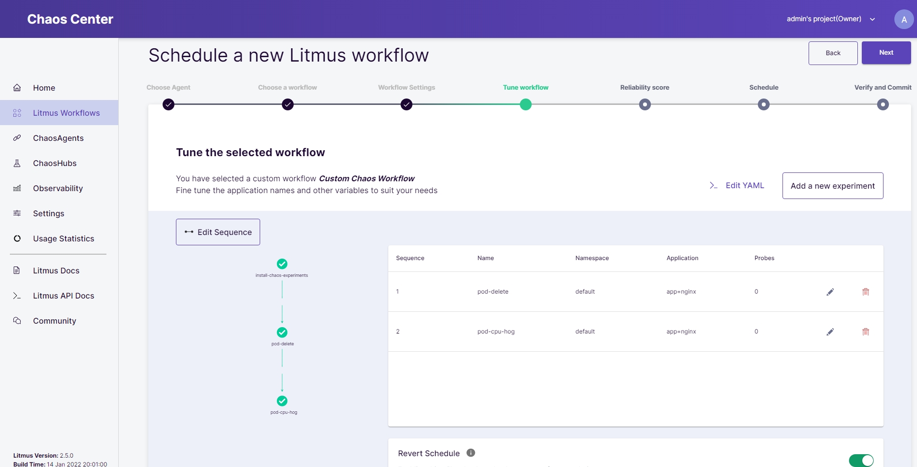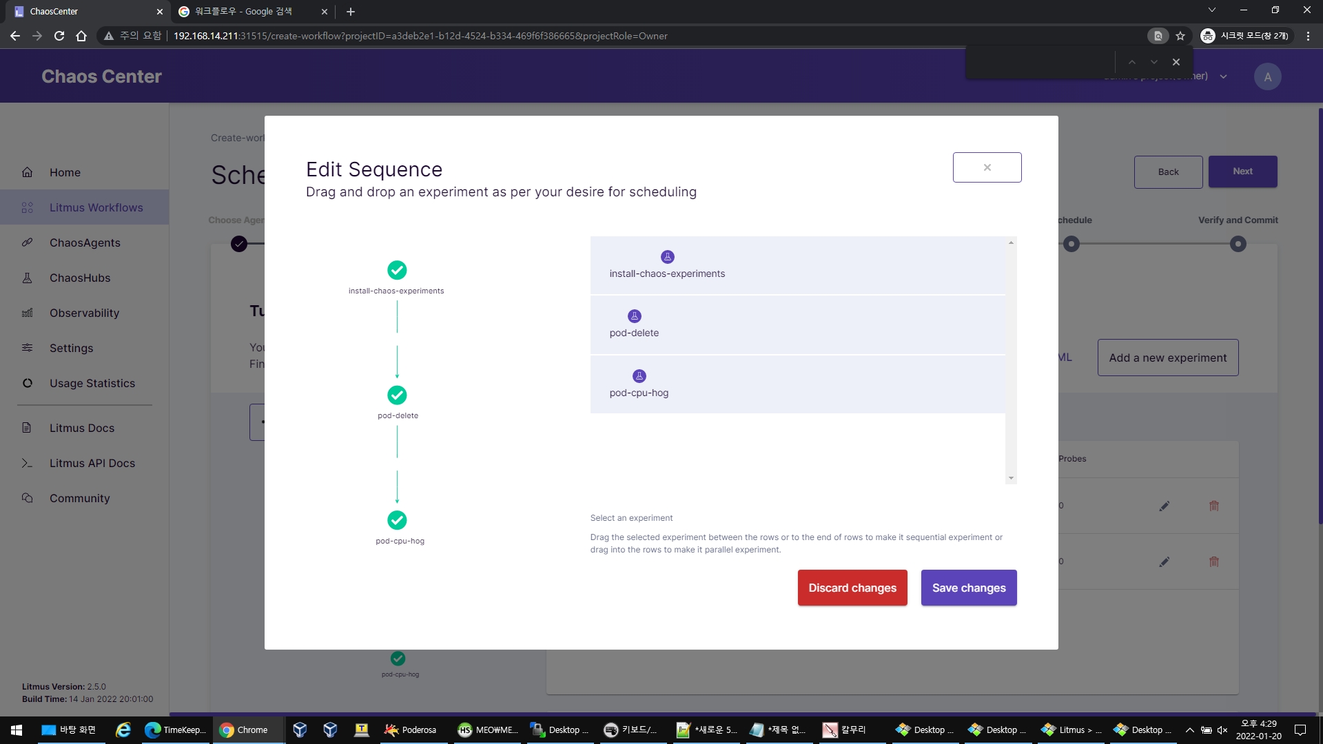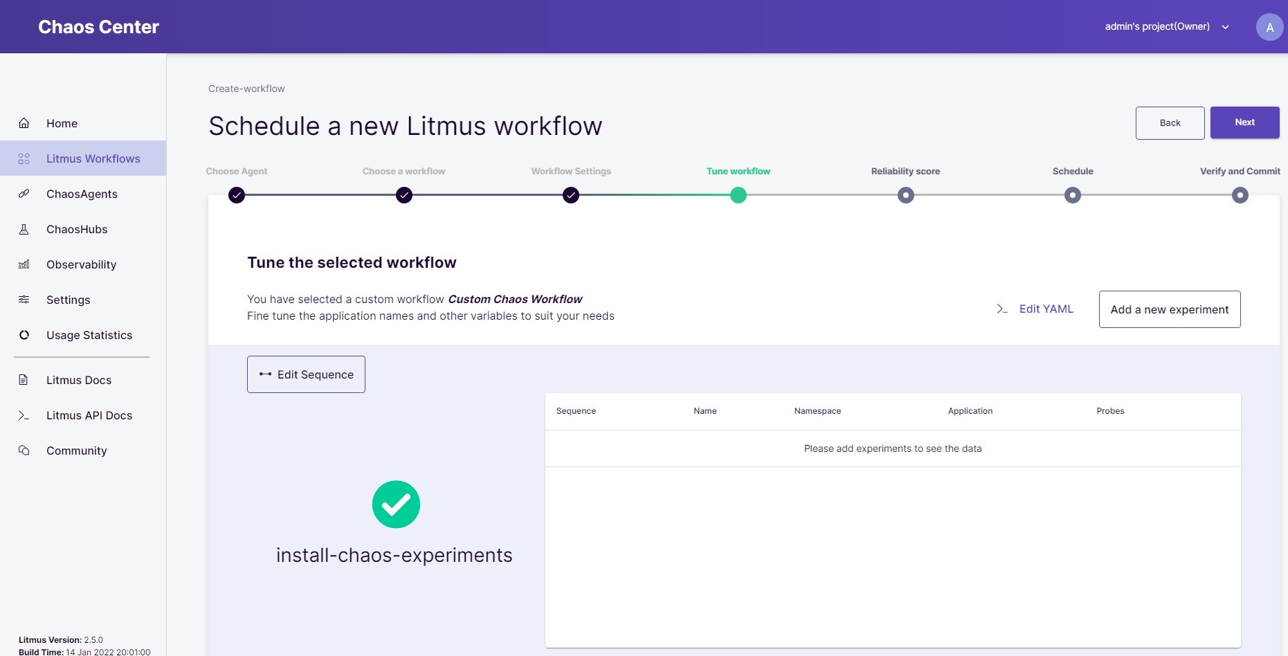 - Create a new workflow using the experiments from ChaosHubs 선택 후 Next 클릭