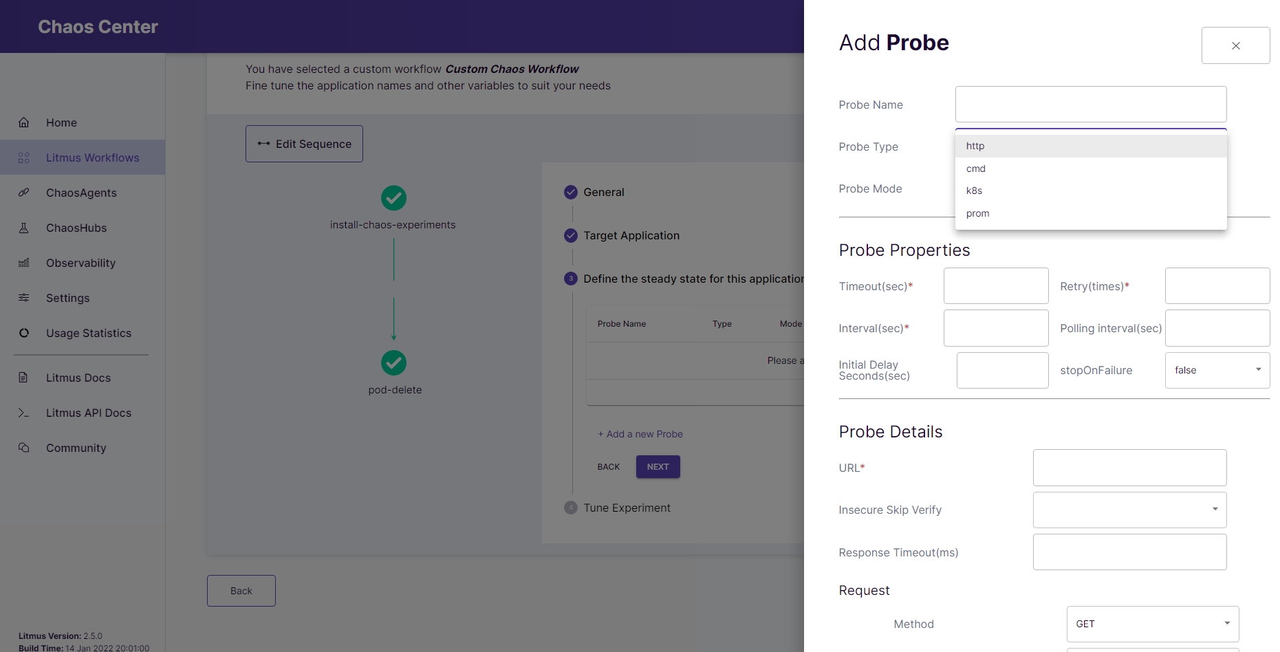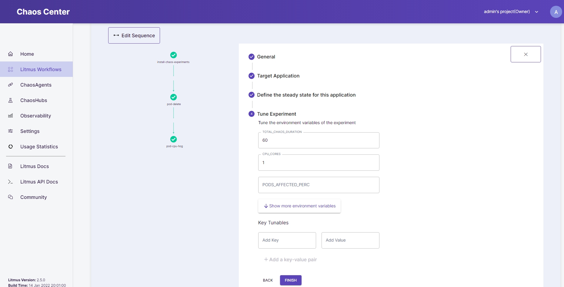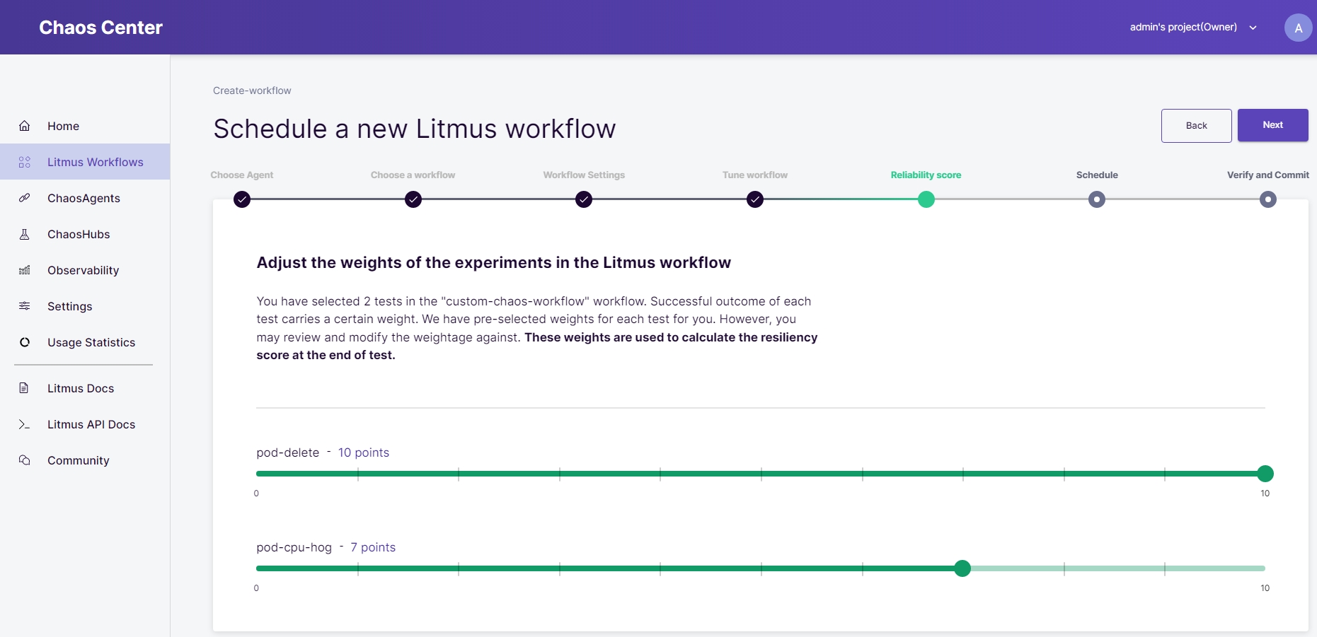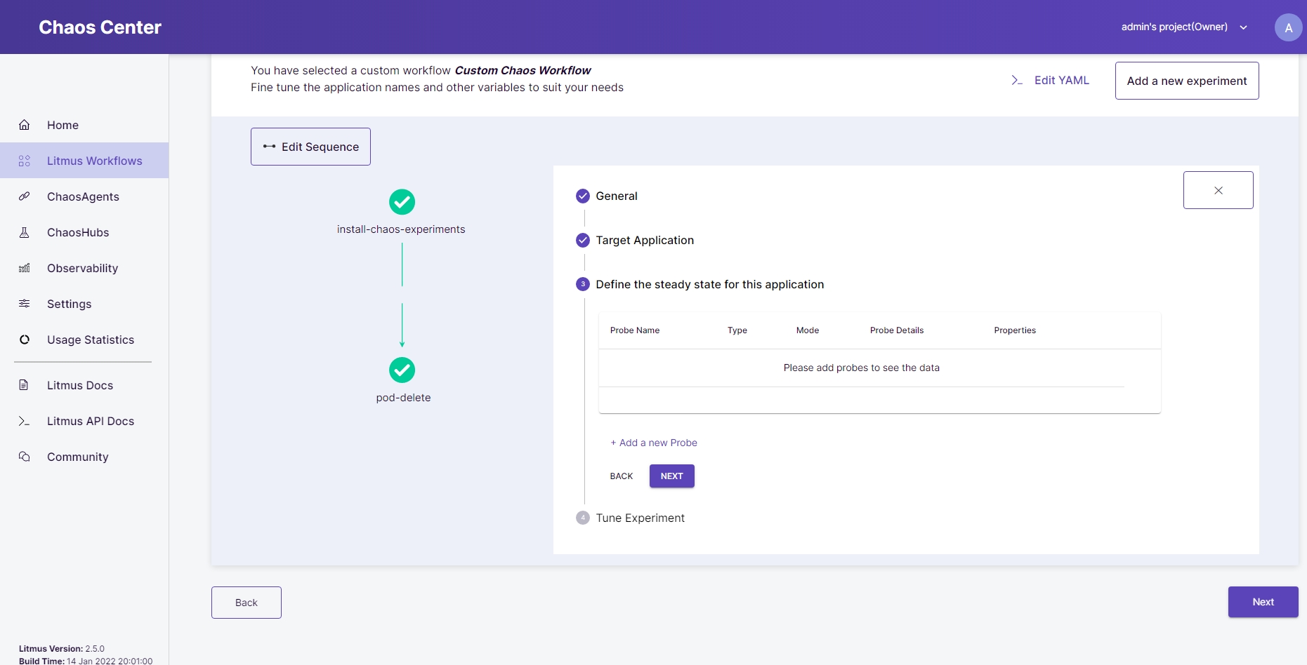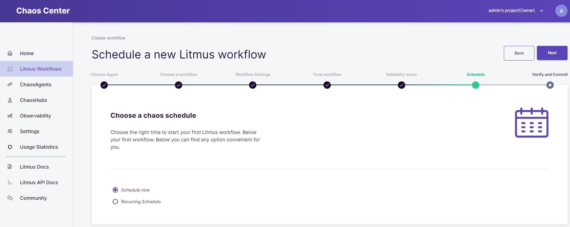 - Create a new workflow using the experiments from ChaosHubs 선택 후 Next 클릭